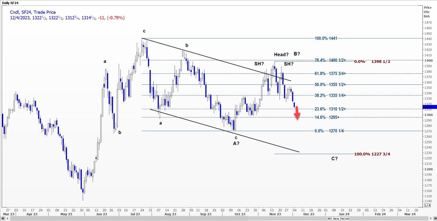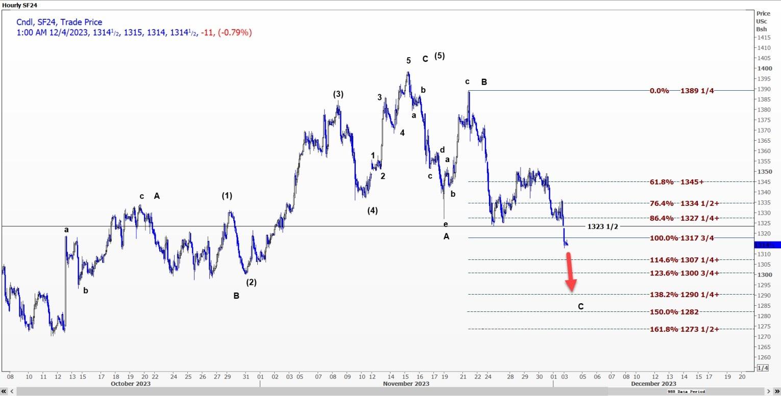 受C波推动,CBOT大豆1月合约SF24可能跌至每蒲式耳13.0075美元至13.0725美元区间。