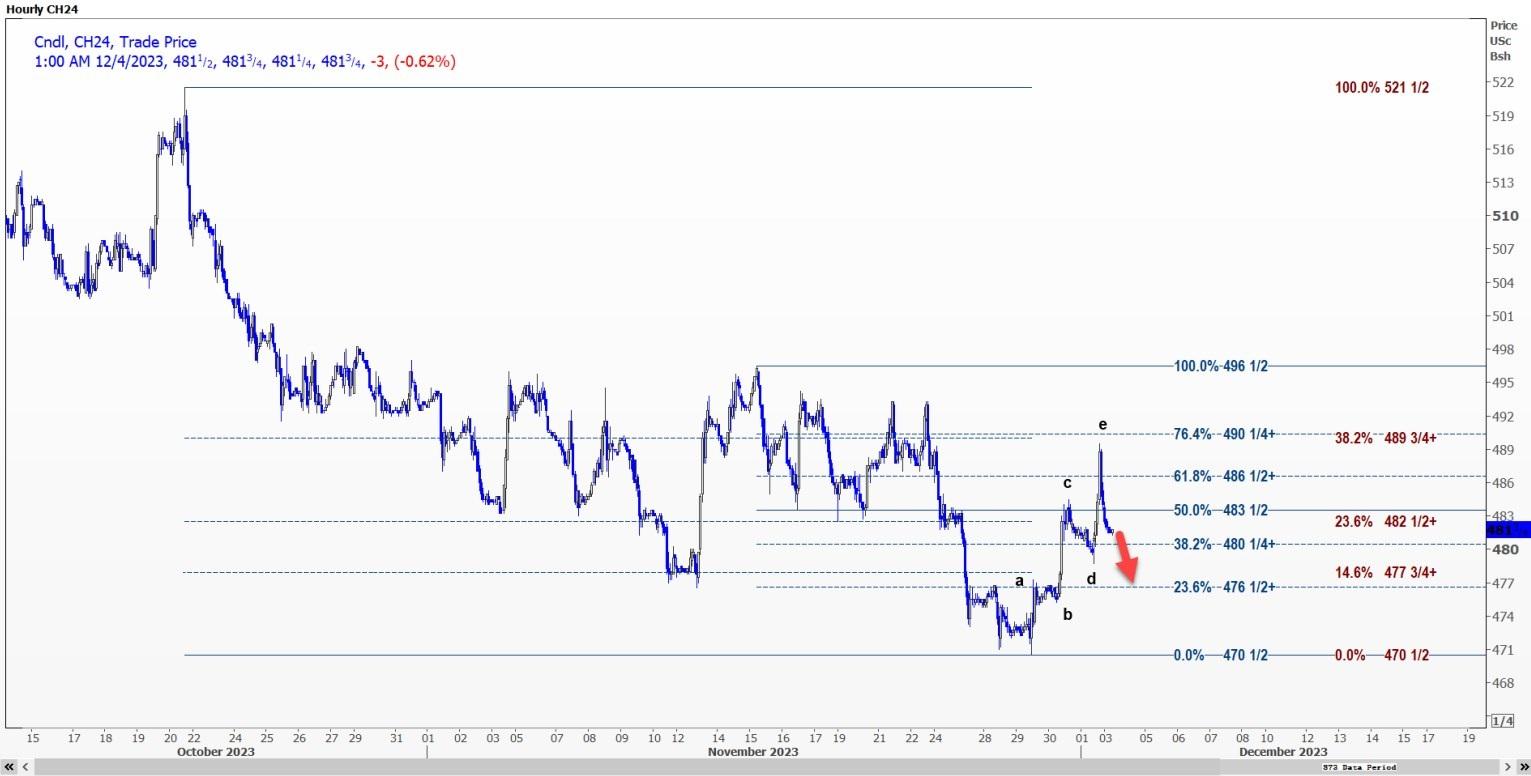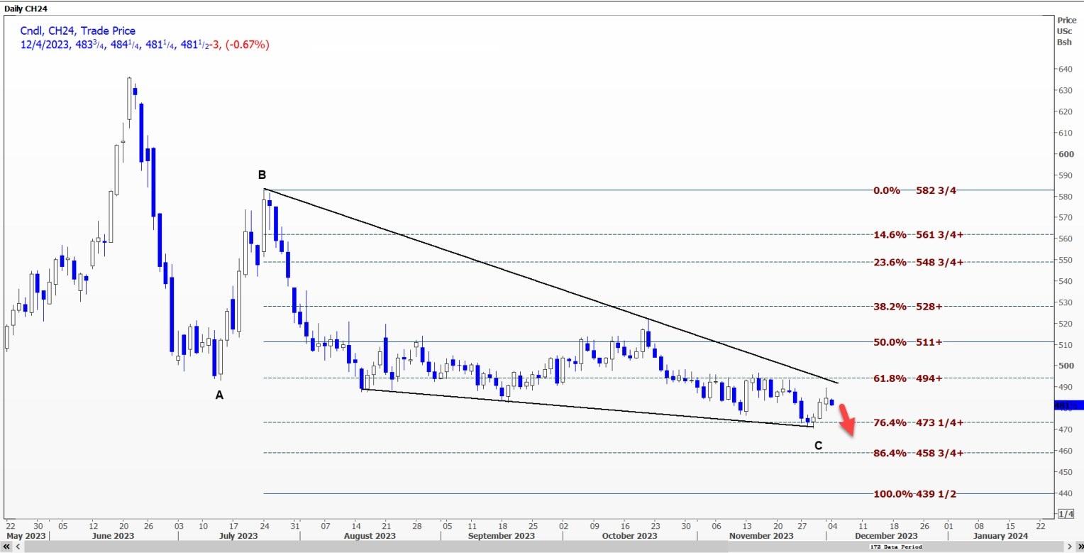CBOT 3月玉米合约CH24可能测试每蒲式耳4.8025美元的支撑位,突破可能打开通往4.7650美元的通道。