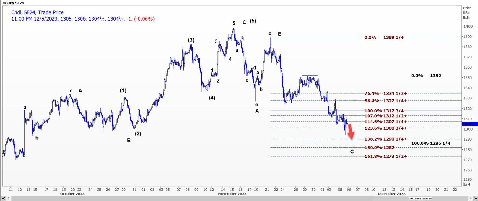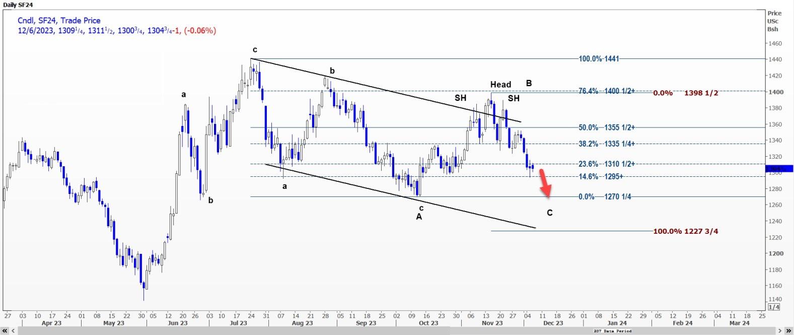 CBOT大豆1月合约SF24可能会测试每蒲式耳12.9025美元的支撑位,跌破该支撑位可能会打开通往12.9025美元的通道。
