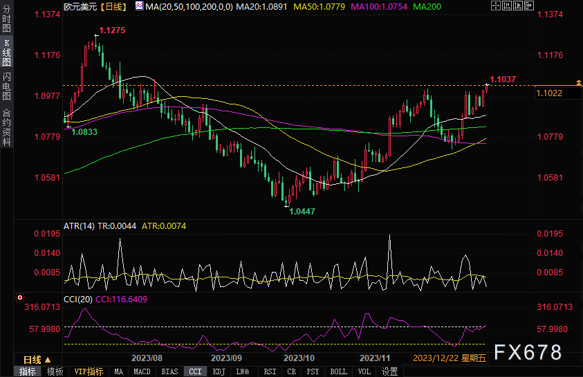 周五(12月22日),欧盘时段,欧元/美元盘中窄幅波动,现报1.1028,涨幅0.16%。