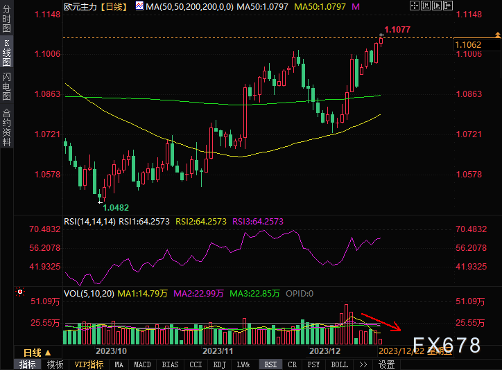 欧元主力价格走高,但成交量在持续缩减,圣诞节日来临前夕交投变清淡,需关注背离风险。