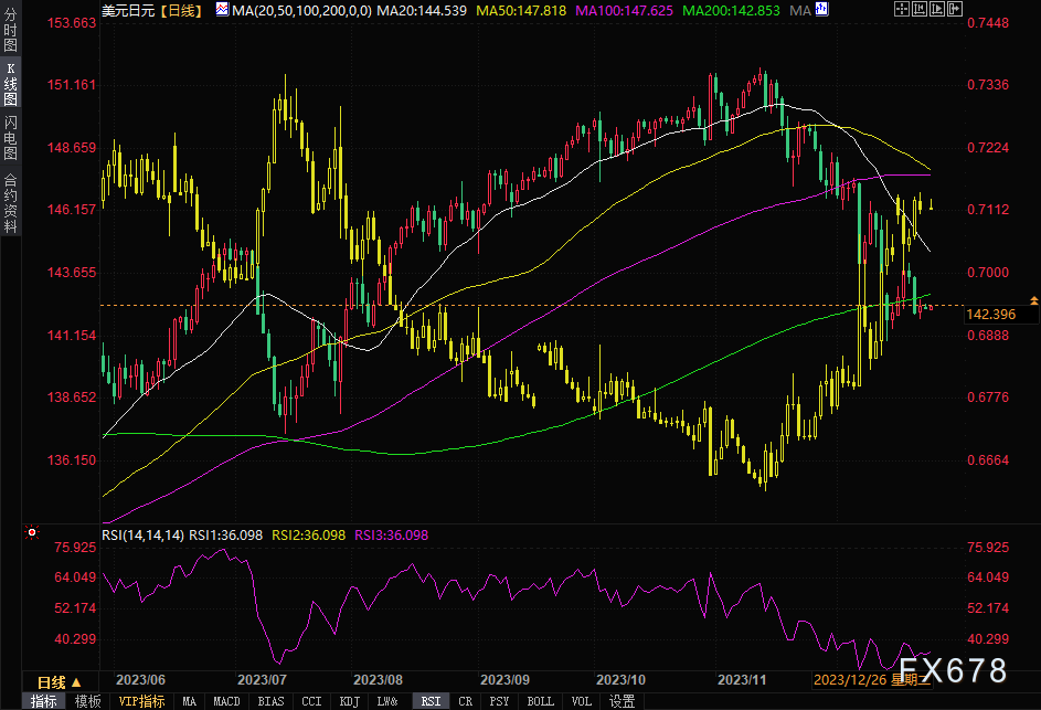 圣诞假期来临,投资者交易热情降低,在流动性缺乏的情况下,美元/日元可能会稳定在142.45左右水平。显然,美元/日元正在从周五损失中恢复,上周五美元/日元跌至141.85支撑位。目前,