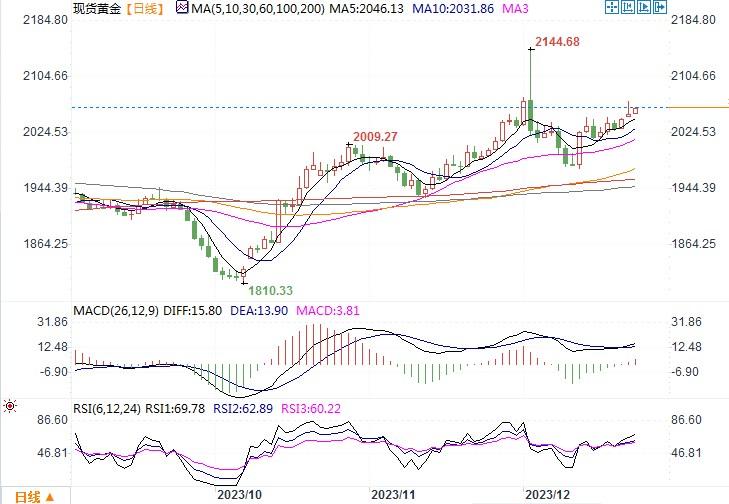 现货黄金价格则一度升至2070美元/盎司上方的多周新高。过去一周,在美联储主席鲍威尔于此前的新闻发布会上“放鸽”之后,多名美联储官员迅速出场灭火,重申2%通胀目标不变,试图缓和市场预期。但是,包括高盛、摩根大通在内纷纷预测明年美联储将降息至少5次。美联储官员们打压降息预测的效果非常有限。 EdwardJones高级投资策略师AngeloKourkafas表示,“人们将继续认为美联储将转向鸽派。这为市场和市场人气提供了支撑,这一点预计本周不太可能改变。”此外,据巴勒斯坦电视台24日报道,以色列军队当晚对加沙地带中部的迈加齐难民营发动空袭,造成至少70名巴勒斯坦人死亡。报道说,以军空袭地点位于迈加齐难民营人口密集区,死者多数为妇女和儿童,伤亡人数可能会继续上升。巴以冲突的持续升级,也将在一定程度给到黄金避险买盘理由。