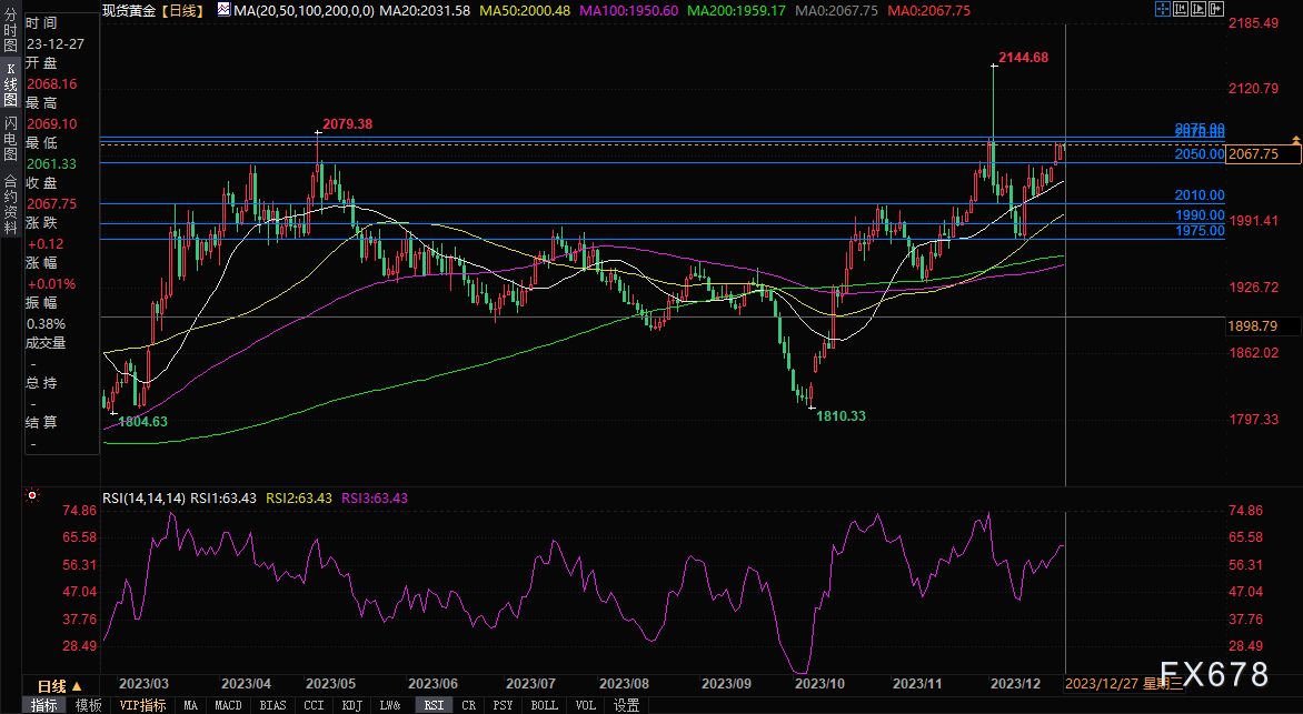 现货黄金正位于2070-2075美元重要阻力区域下方。之前持续突破这个阻力的尝试都没有成功,这次历史可能会重演。