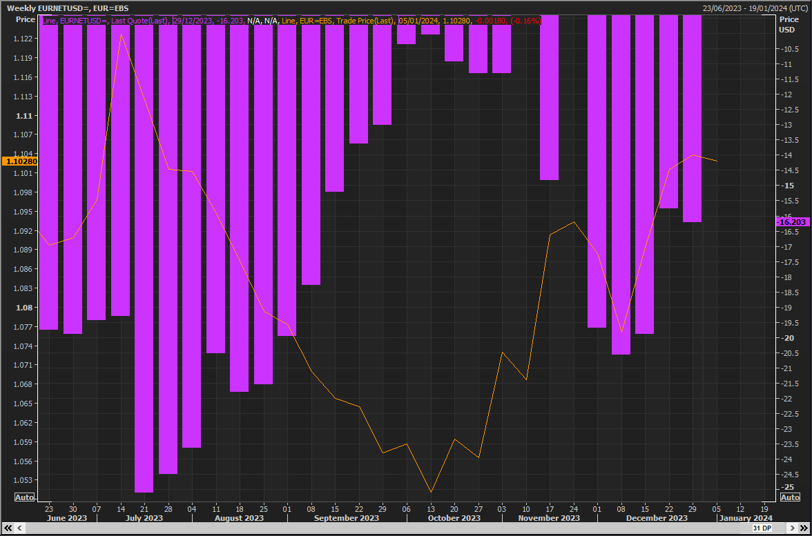 欧元净多头头寸从157亿美元增至162亿美元。投机客经常重返成功的头寸,2024年重返多头可能推动欧元进一步上涨。
