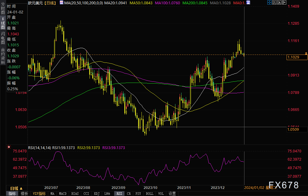 随着1月份到来,欧元/美元汇率处于21日收盘价1.1010上方。上周四(12月28日),欧元/美元盘中触达1.11415高点,随着元旦假期开始来临,价格从高点回落。