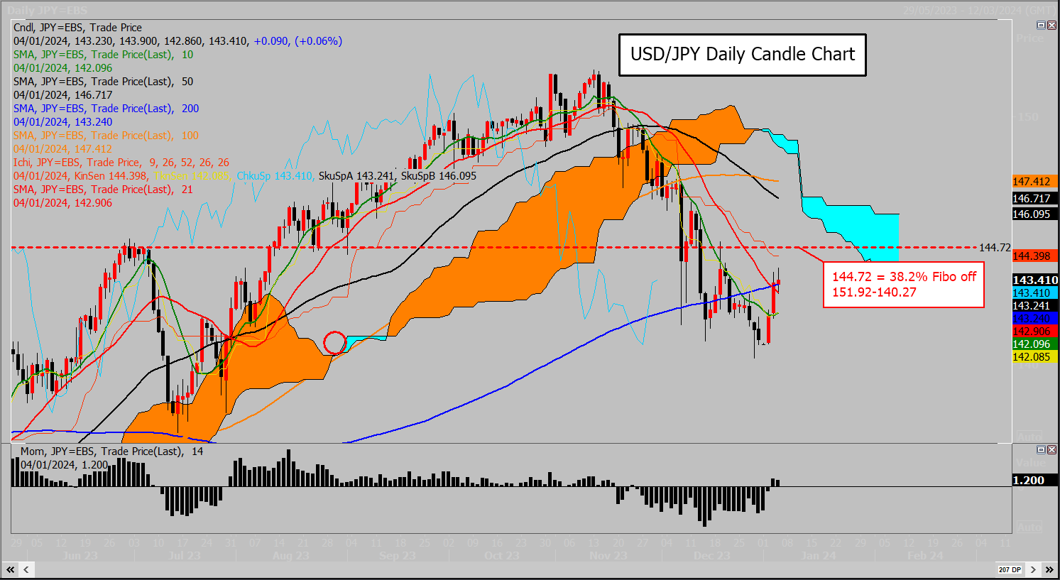 然而,在周四早些时候攀升至143.90(EBS)后,涨势停滞不前形成空头交叉,21日均线下穿200日均线。收盘若在200日均线143.24下方,可能使空头重回控制地位。