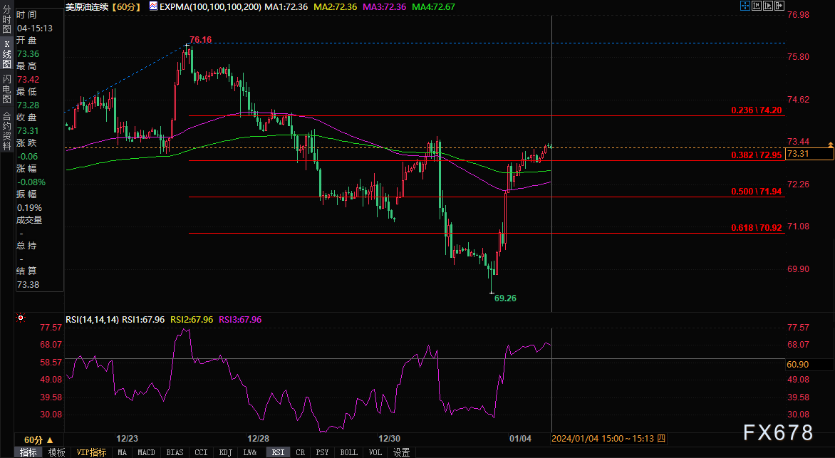 美原油连续震荡走高,盘中报73.4美元每桶,涨幅0.57%。