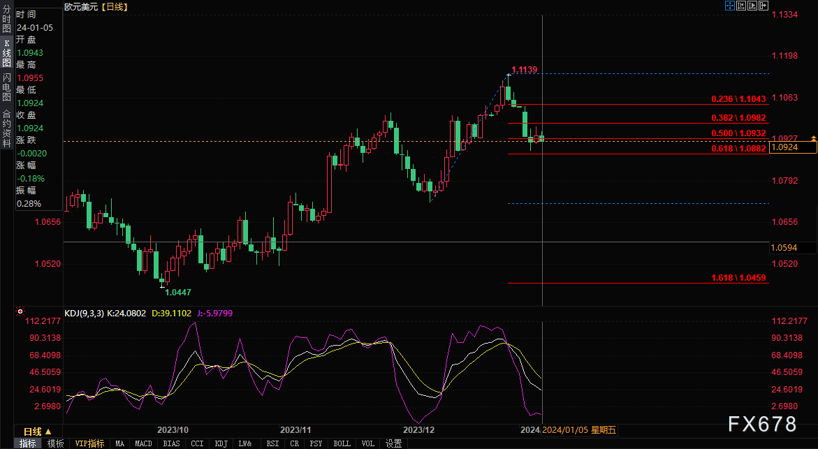 周五(1月5日),欧盘时段,欧元/美元交投于1.0927/26,跌幅0.16%;欧元主力交投于1.0959/58,跌幅0.18%。