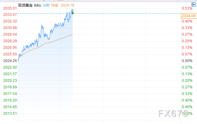 现货黄金延续日内反弹势头,一度逼近2035美元/盎司,较日低上涨10美元。