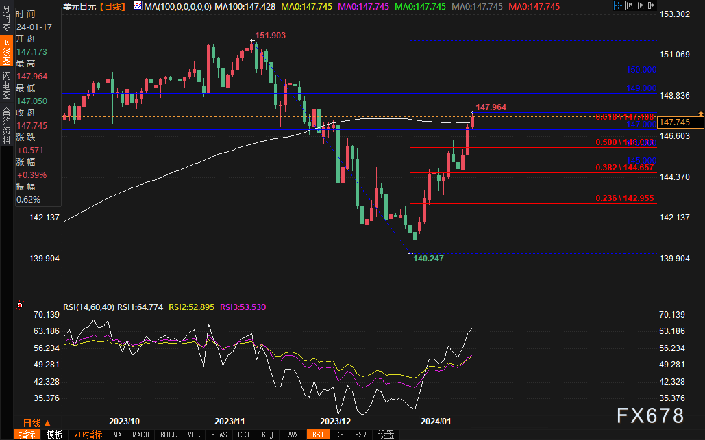 周三(1月17日),欧洲时段,美元/日元震荡走高,盘中报147.673,涨0.34%。日元主力报0.6836,跌0.31%。