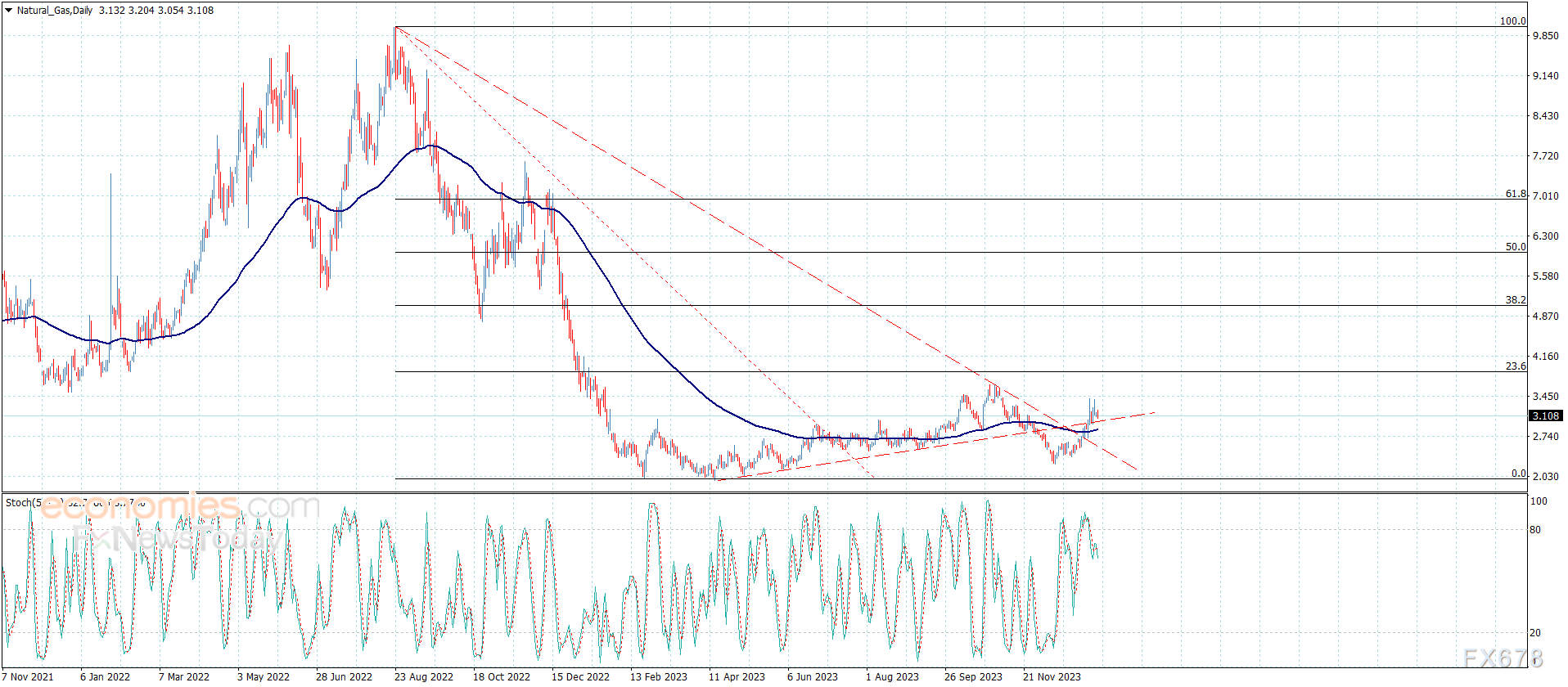 虽然天然气价格缺乏积极势头,但主要支撑位2.530和55均线2.830形成有力支撑。如果行情转好,有望打开通往3.400-3.900的道路。