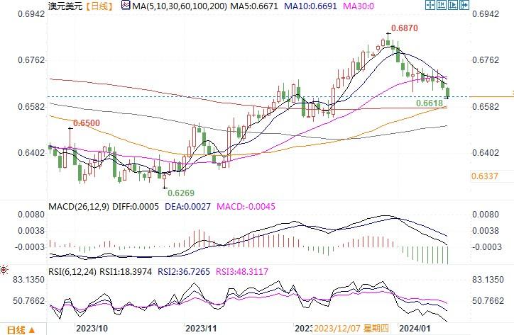 澳元兑美元收盘跌0.4%,报0.6660。澳元在上周一直表现疲软,即使在美国数据显示基本通胀率降温,市场加大了对最快在3月降息的押注之后,澳元表现也是如此。市场目前预计澳洲央行已经完成了紧缩政策,澳洲的隔夜拆款利率峰值将定格在4.35%。而且即便预期澳联储降息时点或会比欧美要延后,但年内降息也将是大概率的事情。再加上近期风险偏好情绪大大下降,澳元在宏观面上获得的支撑因素较为缺乏,故此澳元走势转弱。日线图上,RSI、MACD这类技术指标明显下摆,5、10和21日移动均线下滑,显示澳元进入弱势格局。10月/12月上涨走势的38.2%回档位0.6641是关键支撑位,若跌穿,上年底的低位0.6520-0.6500区域将面临着考验。上方只有回到0.6760之上,澳元/美元方有望扭转跌势。