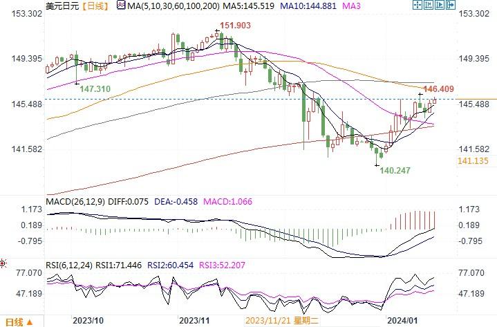 美元指数整体变化不大,但美元/日元却上升了0.63%至145.83,接近12月中旬以来的最高水平。这主要是市场预期日本央行将在下周的政策会议上维持超宽松政策不变,对日本提前结束超宽松利率政策的预期也渐渐减弱。本周各主要经济体的经济数据较少,因此美联储理事沃勒周二的讲话较为关键。沃勒将讨论经济前景,并反映鲍威尔的想法,沃勒的讲话将被仔细研究以寻找线索,可能成为美元和外汇市场走势的关键。如果沃勒讲话中透出美联储不急于降息的信息,美元将大概率地维持稳中有升的走势状况。而日元在利率差方面维持着劣势,恐将进一步遭到被推低的走势倾向。日线图上,隔夜一根阳柱体,几乎吞没了前两个交易日的跌幅,MACD平滑异同移动均线的信号线仍保持强烈上摆,美元/日元经过短线调整后似乎保持着上行态势。近期还需继续密切留意146附近高点的阻力能否被破,若彻底穿越,美元/日元将保持向高位攀升的走势。若相反,则预示美元/日元顶部的确立。