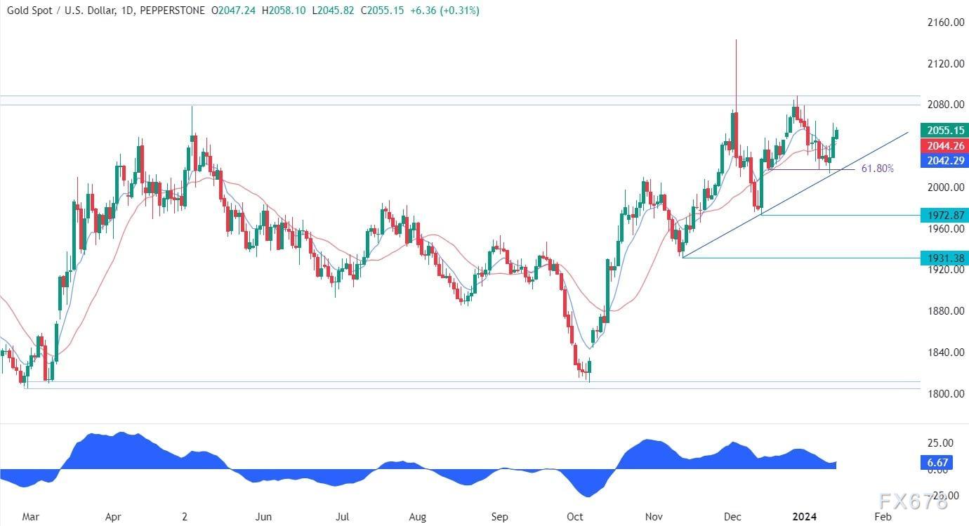 在日线图上,我们可以看到黄金在关键趋势线上反弹(也是61.8%斐波那契回撤位位置),初步阻力为2060美元。买家现在把目标放在2080阻力位,如果成功突破,有望创出新的历史高点。另一方面,卖家希望价格保持在2080美元以下,以再次调整趋势线。