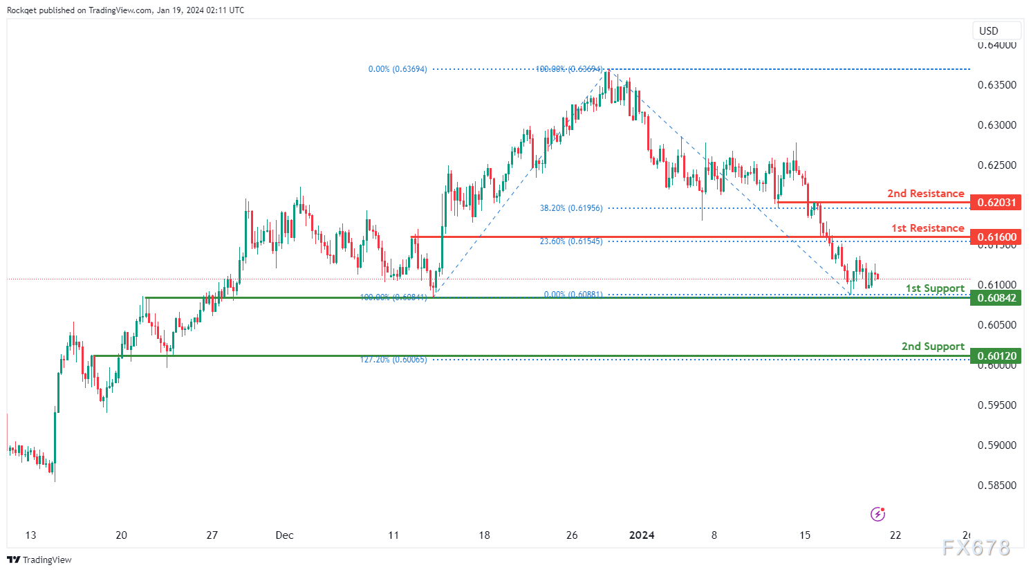 第一个阻力位0.6160被视为回调阻力,与23.60%斐波那契回撤位一致。在更高的位置,第二个阻力位0.6203是一个重叠阻力,与38.20%的斐波那契回撤位一致,表明进一步上行的潜在障碍。