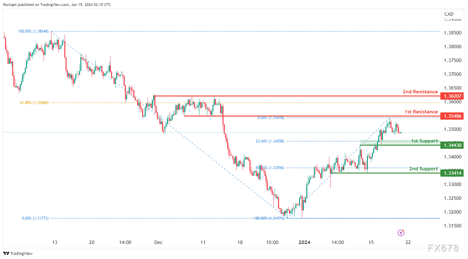 上行方面,第一个阻力位1.3548被视为回撤阻力。更高的第二个阻力位1.3620也是一个回调阻力,接近61.80%的斐波那契回撤位,进一步加强了其作为潜在阻力区的重要性。