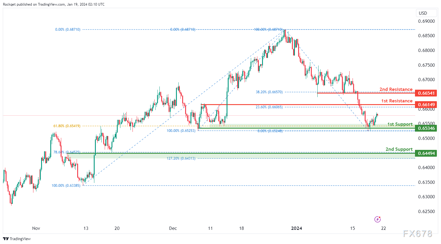 第一个阻力位0.6614被视为回调阻力,与23.60%斐波那契回撤位一致。在更高的位置,第二个阻力位0.6654也是一个回调阻力,与38.20%的斐波那契回撤位一致,表明进一步上行的潜在障碍。