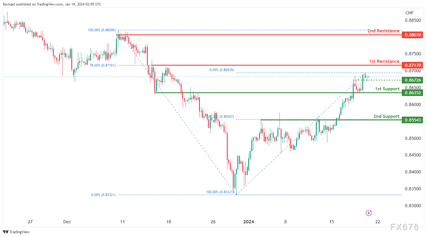 第一个阻力位0.8717被视为回调阻力,与78.60%的斐波那契回撤位一致。更高的第二阻力位0.8807也被视为回撤阻力,进一步强化了其作为潜在阻力区的重要性。