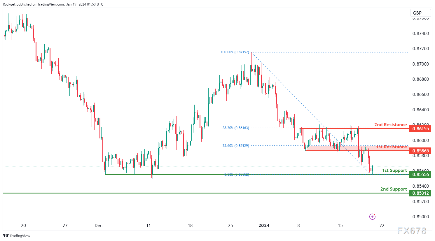 第一个阻力位0.8586被视为重叠阻力位,接近23.60%斐波那契回撤位。在更高的位置,第二个阻力位0.8615是一个回调阻力,与38.20%的斐波那契回撤位一致,表明进一步上行的潜在障碍。