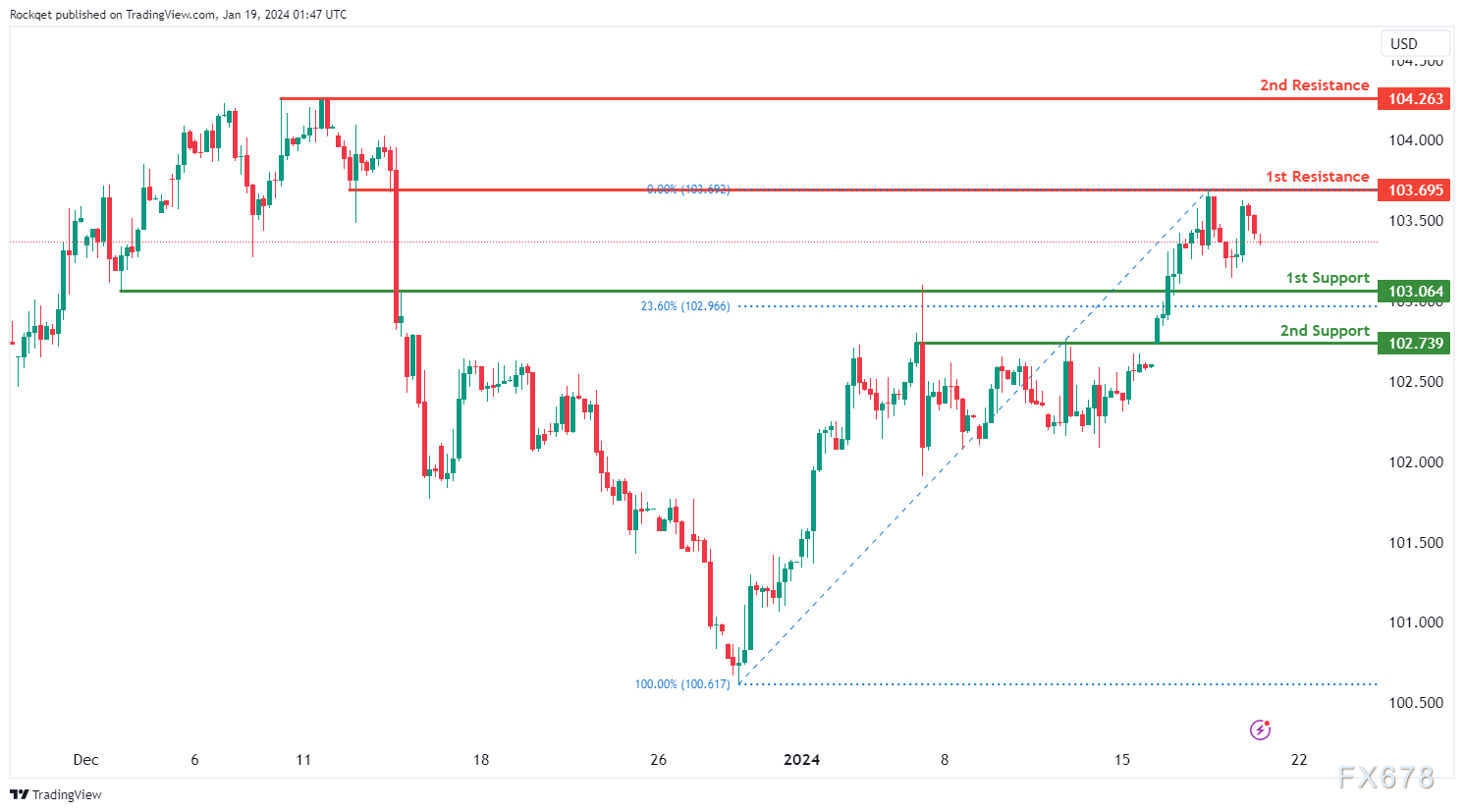 上行方面,第一阻力位103.69被视为重叠阻力位。更高的第二阻力位104.26被视为回调阻力位,进一步强化了其作为潜在阻力区的重要性。