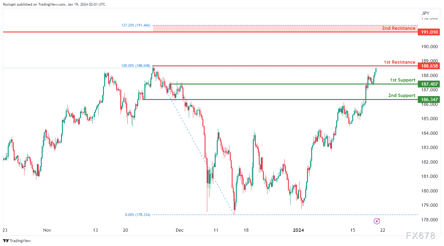 第一阻力位188.65被认为是一个摇摆阻力。更高的第二阻力位191.01是一个回调阻力,接近127.20%的斐波那契扩展水平,进一步加强了其作为潜在阻力区的重要性。