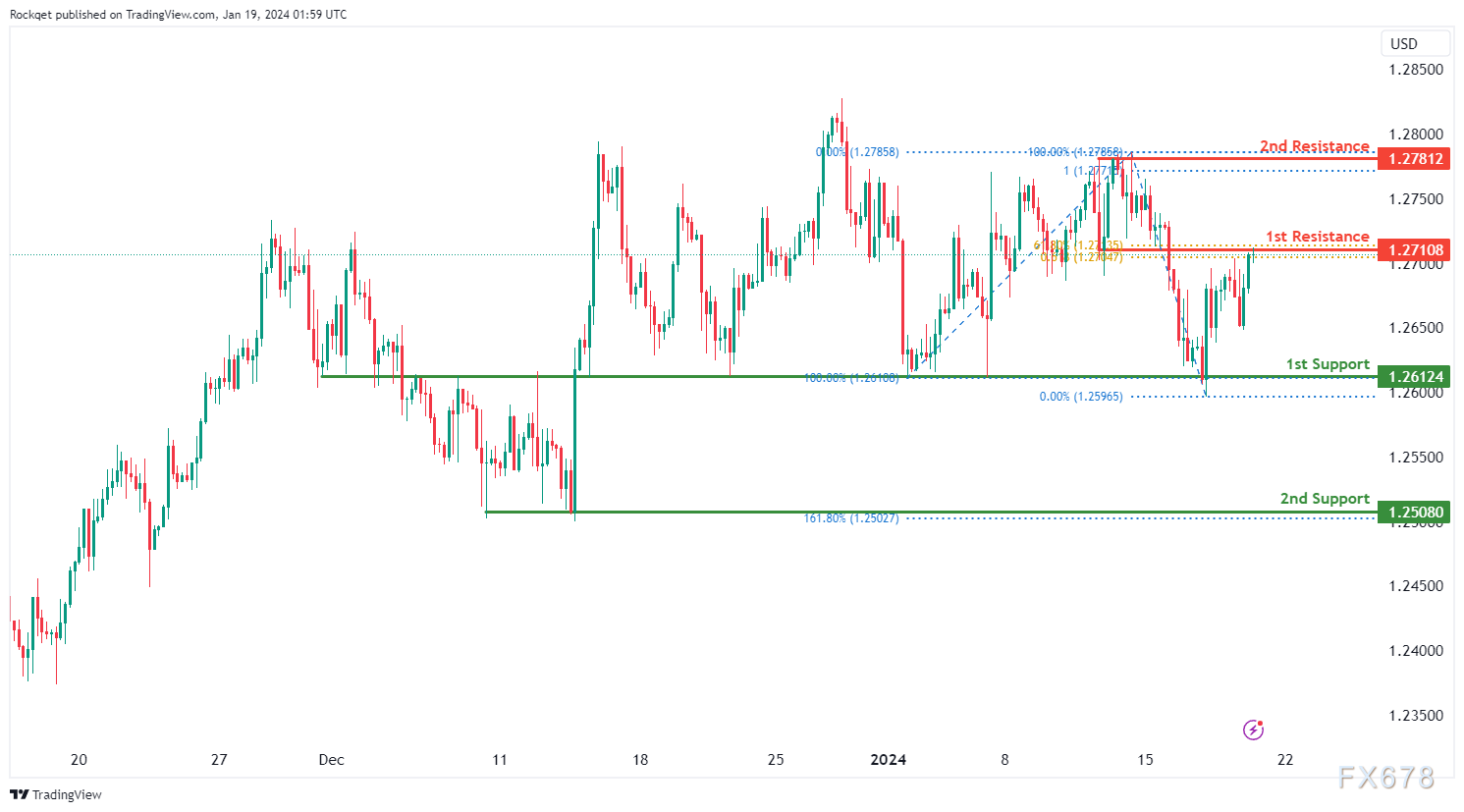 第一个阻力位1.2710被认为是一个重叠阻力,与61.80%斐波那契回撤位汇合点一致。在更高的位置,第二个阻力位1.2781被视为一个摆动高点阻力位这表明进一步上行的潜在障碍。