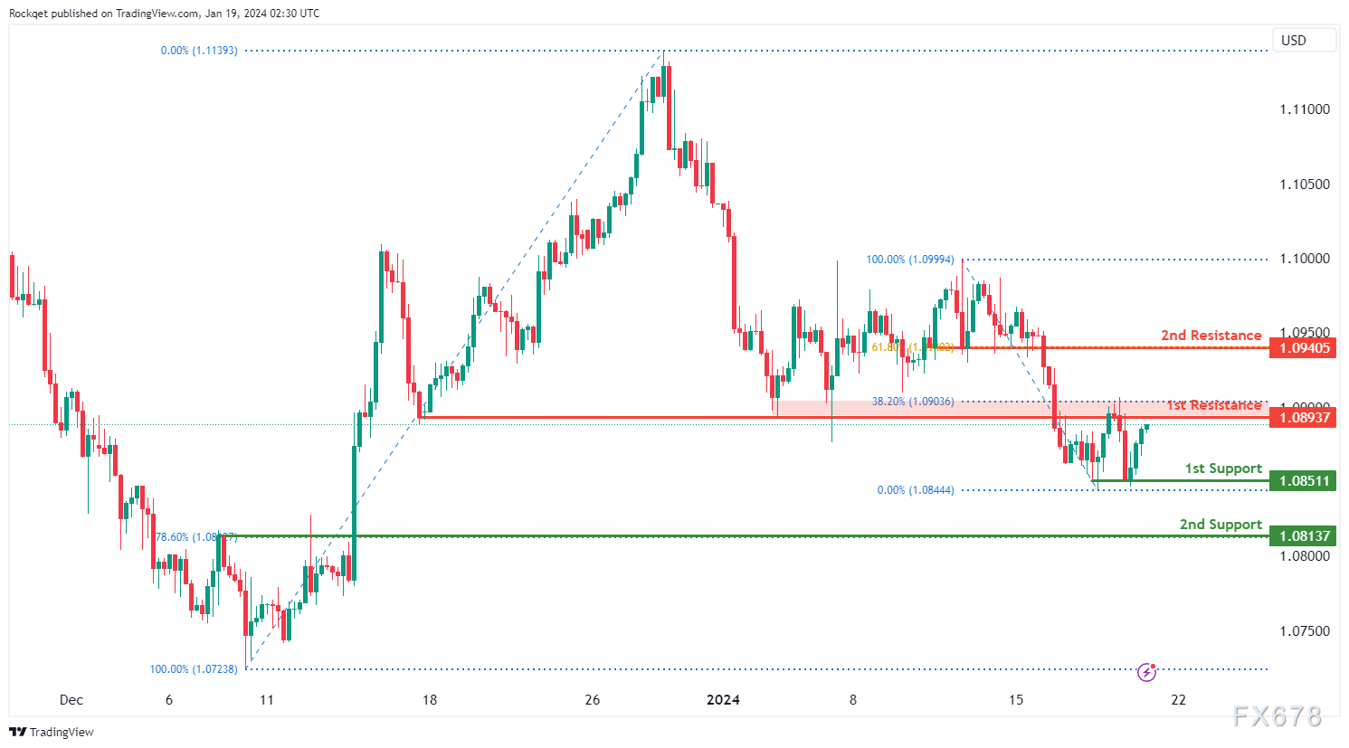 第一个阻力位1.0893被视为回调阻力,接近38.20%的斐波那契回撤位。在更高的位置,第二个阻力位1.0940也是一个回调阻力,与61.80%的斐波那契回撤位一致,表明进一步上行的潜在障碍。