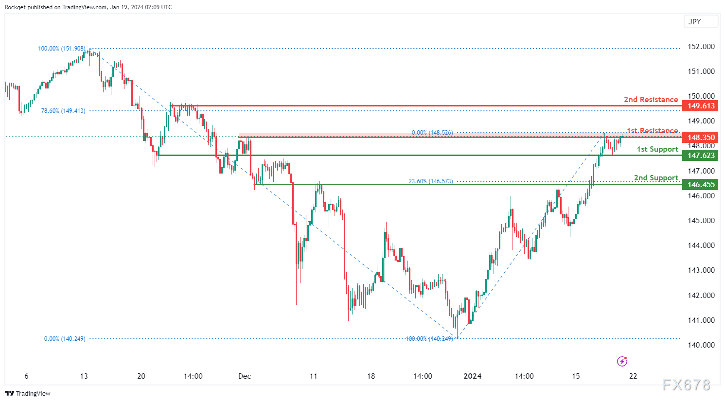 第一个阻力位148.35被视为回撤阻力。更高的第二个阻力位149.61也是一个回调阻力,接近78.60%的斐波那契回撤水平,进一步加强了其作为潜在阻力区的重要性。