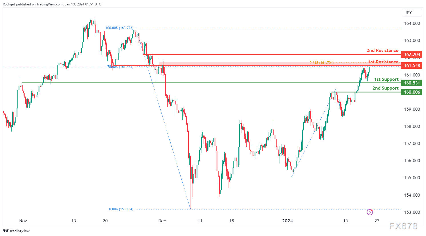 第一个阻力位161.54被认为是一个重叠阻力位,它与斐波那契水平的汇合点一致,即78.60%的回撤位。更高的第二阻力位162.20也被认为是一个重叠阻力,进一步加强了其作为潜在阻力区的重要性。