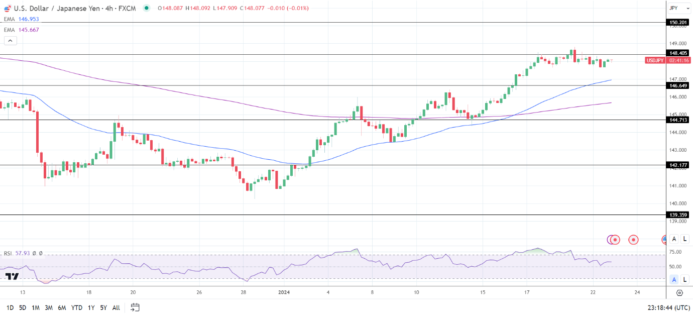 14周期4小时RSI为57.93,表明美元/日元在进入超买区域之前将升至149关口。