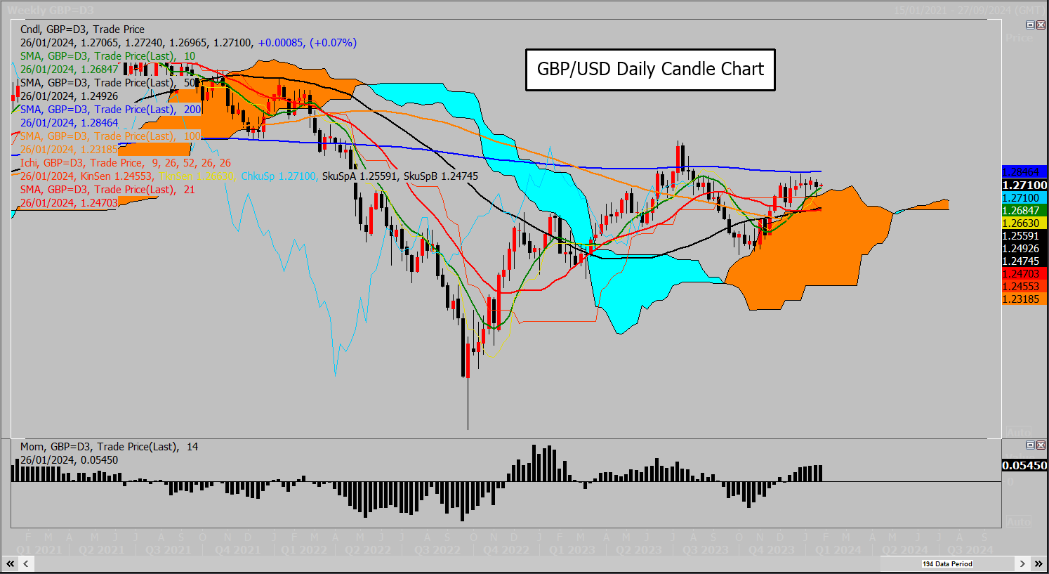 英镑受到厚厚的上升日线云区支撑:顶部在1.2578;50日移动均线1.2646也带来支撑。买入水平仍为周线云顶1.2616和200周均线1.2846。