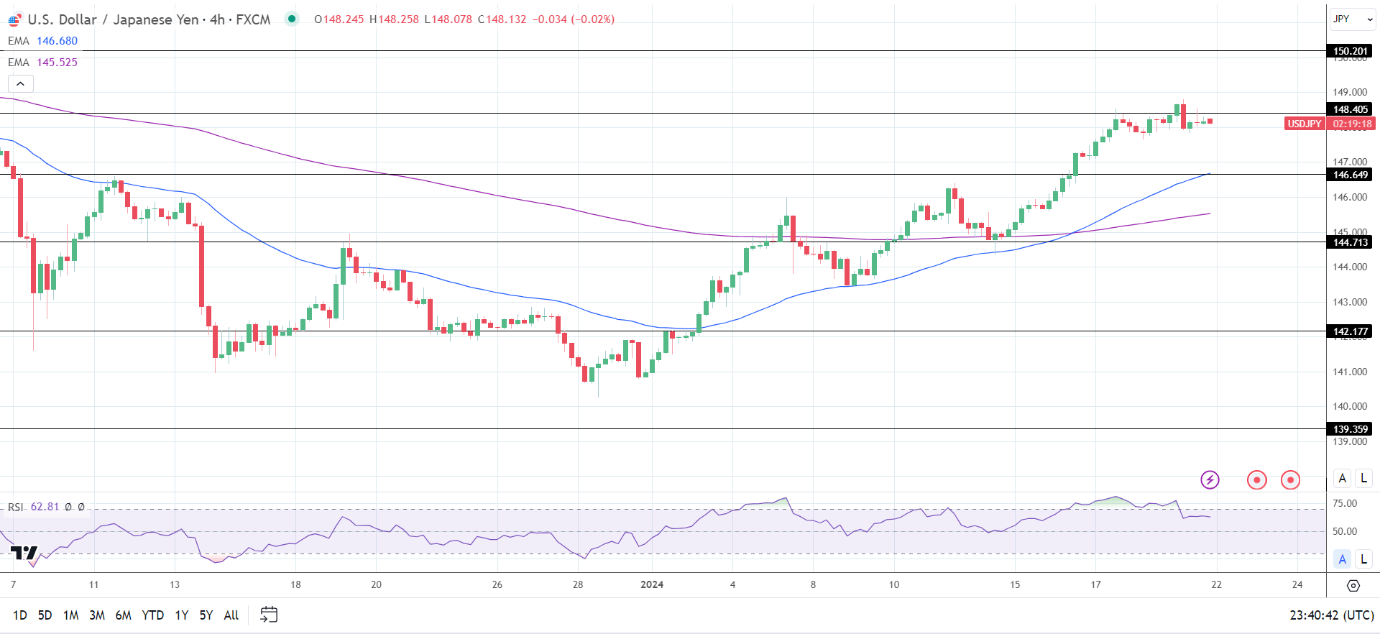 周一(1月22月)亚市,美元/日元小幅走弱,目前下跌0.22%,交投于147.82附近。美联储进入FOMC静默期、日本3月份“春斗”工资数据发布前,汇市将焦点转向本周晚些时候发布的日本央行决议,这将为今年超宽松转向紧缩的“黑天鹅”事件奠定基础。技术分析指出,美元/日元在148看涨趋势未减。