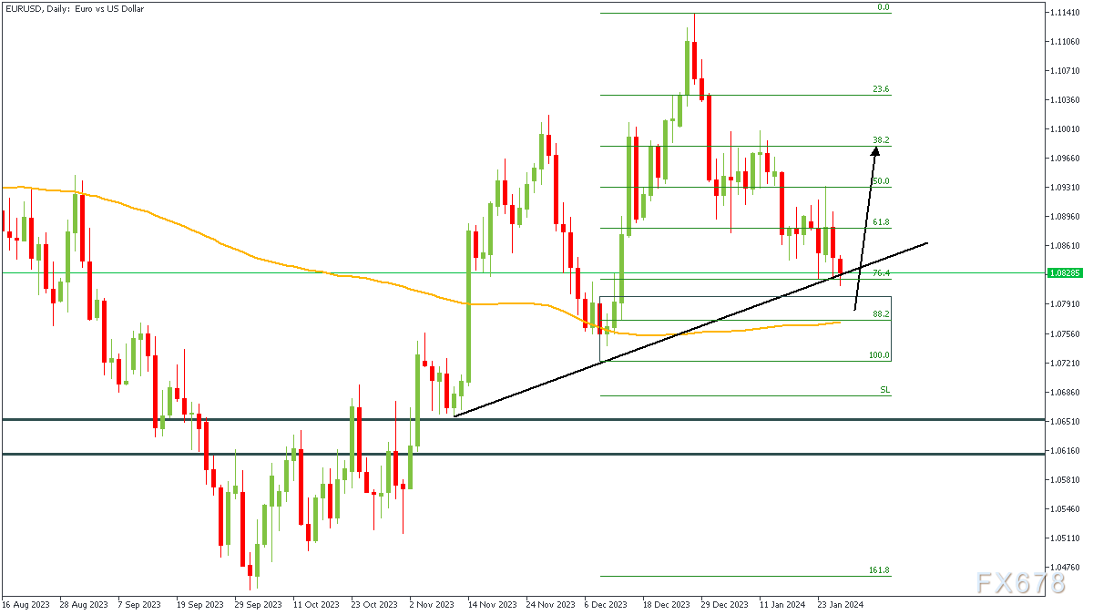 欧元兑美元目前位于支撑趋势线和76%斐波那契回撤位上。200日移动均线作为支撑存在,88%斐波那契回撤位正好位于跌平涨形态(Drop-Base-Rally)需求区上方,这就得出了支持看涨结果的结论。