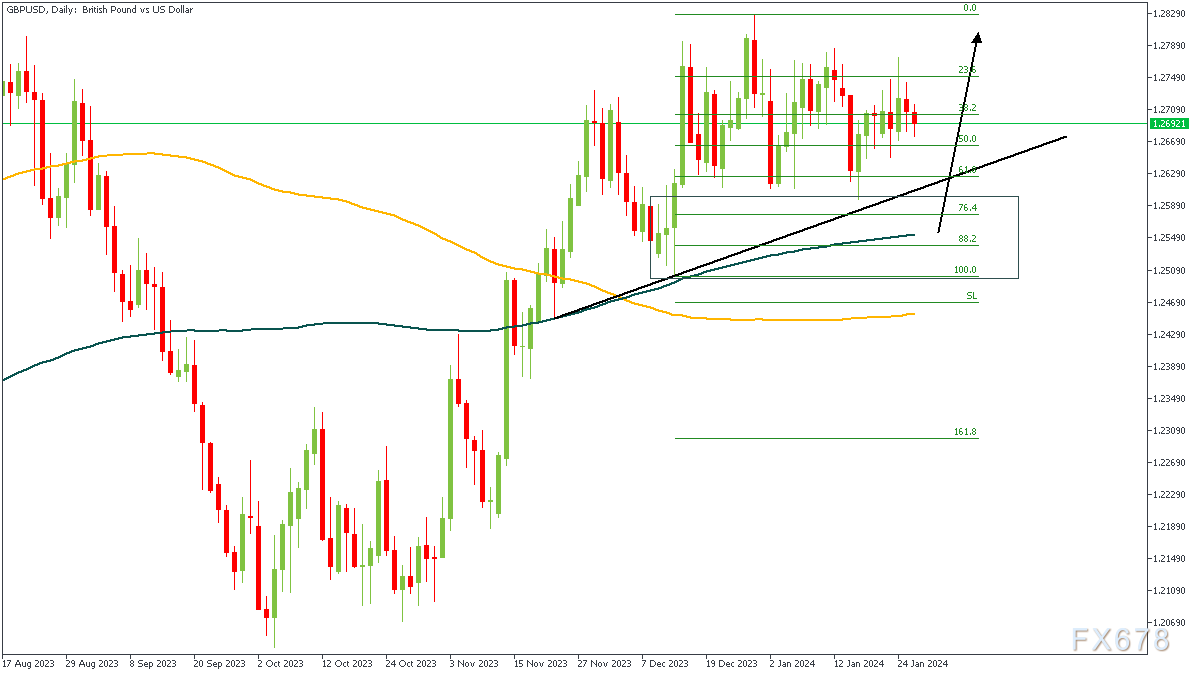 英镑兑美元日线图上,价格看起来波动比较大,但价格走势表明,上一次结构突破是看涨突破,我的进场建立在跌平涨形态(Drop-Base-Rally)形成的基础之上。这个形态与看涨移动平均线、100日移动均线支撑位、76%斐波那契回撤位以及趋势线支撑“配合”得很好。所有这些都表明,市场可能很快就会出现看涨的结果。