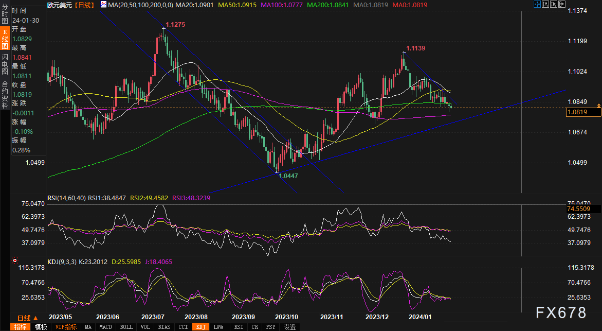 周二(1月30日)欧市时段,欧元/美元在亚盘时段一度走高后回落,在1.0822(12月从1.0724至1.1139升幅的76.4%回撤位)附近波动,现报1.0825,跌幅0.05%。