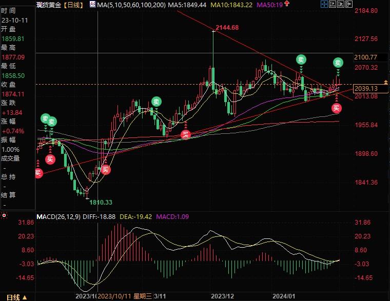 鉴于金价的看涨趋势可能保持完好,预计短期内的强劲阻力位将在昨日的高点2056美元/盎司,若突破此位置,金价将挑战12月12日的高点2062美元/盎司。若再突破这一水平,金价有望首先涨至2100.00美元/盎司。