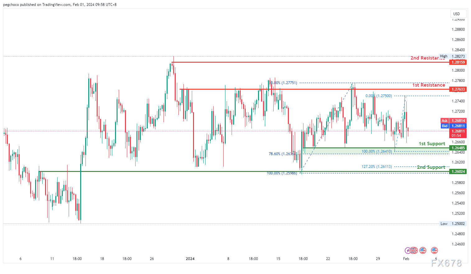 第二个支撑位在1.2601,为重叠支撑位,与127.20%斐波那契延伸线相关,进一步强调了其作为潜在支撑区的重要性。