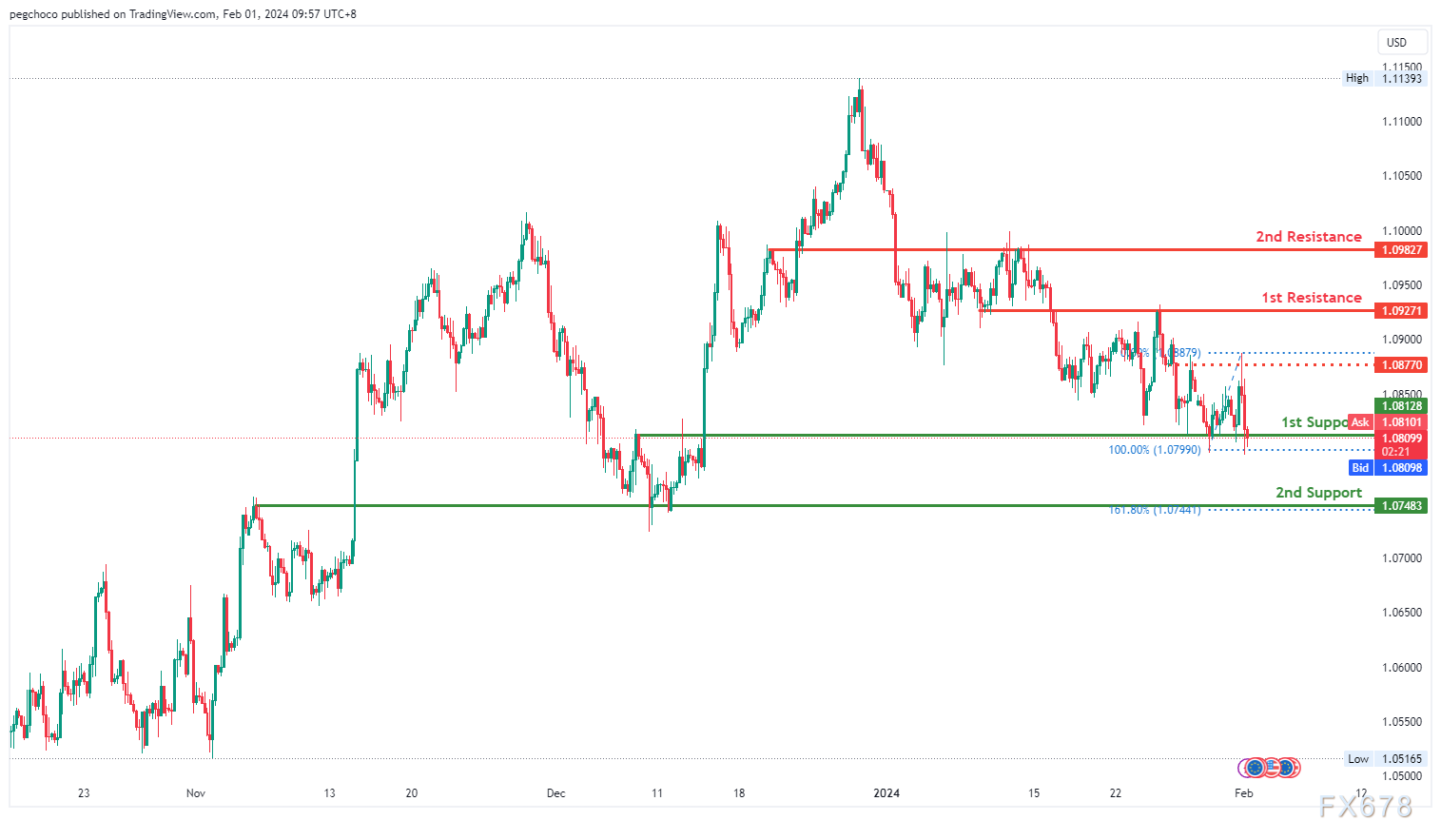 第一个支撑位1.0812为重叠支撑位,该支撑位具有历史意义,可能会成为强势支撑位,也可能会出现买入兴趣。