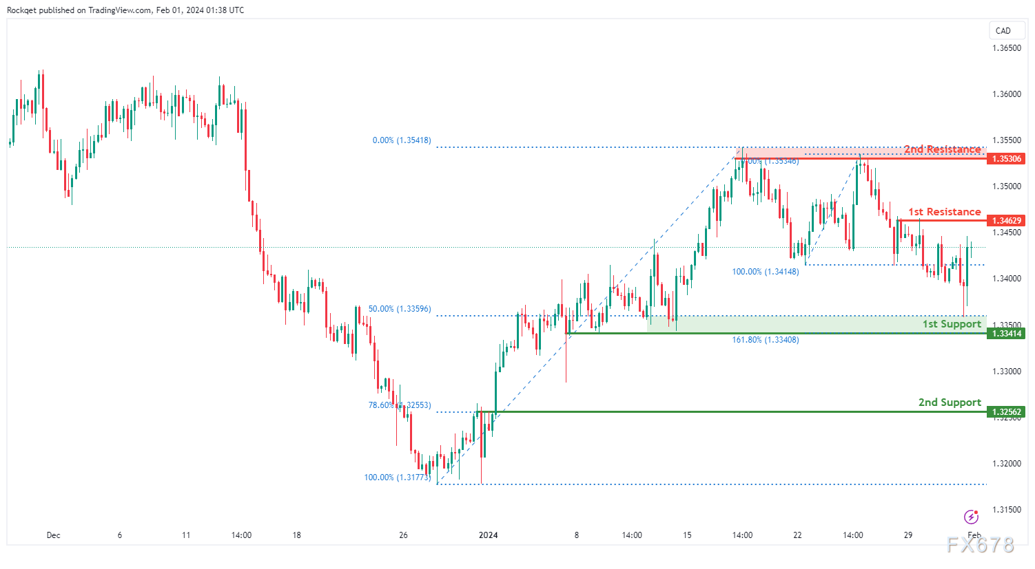 第一个支撑位1.3341被视为回调支撑位,该支撑位接近50.00%斐波那契回撤位。再往下,1.3256处的第二支撑位也被标记为与78.60%斐波那契回撤位对齐的回调支撑位,进一步强调了其作为潜在支撑区的重要性。