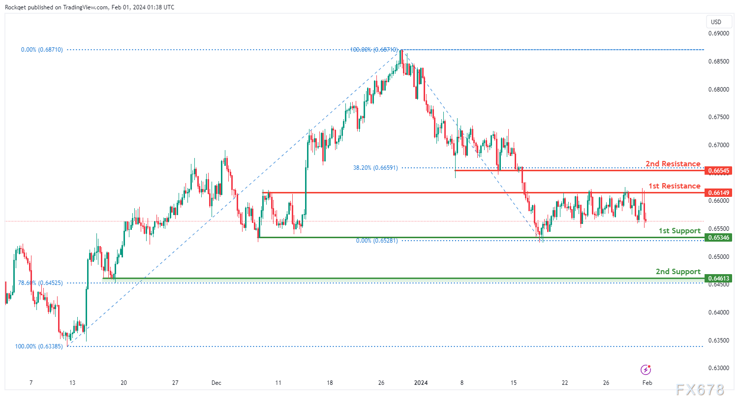 第一阻力位0.6614被视为回调阻力位。更高的第二阻力位0.6654也被标记为与38.20%斐波那契回撤位一致的回调阻力位,进一步突出了其作为潜在阻力位的重要性。