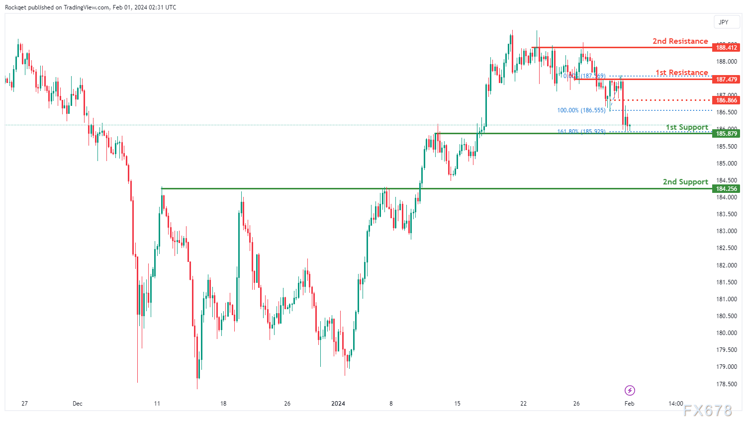 第一个支撑位185.879比较重要。首先,它为重叠支撑位,表明购买兴趣之前已经出现的历史水平。此外,该支撑位与161.80%斐波那契延伸线一致,增加了其重要性。第二个支撑位184.256被认为是回调支撑位,为潜在支撑区提供了额外的力量。