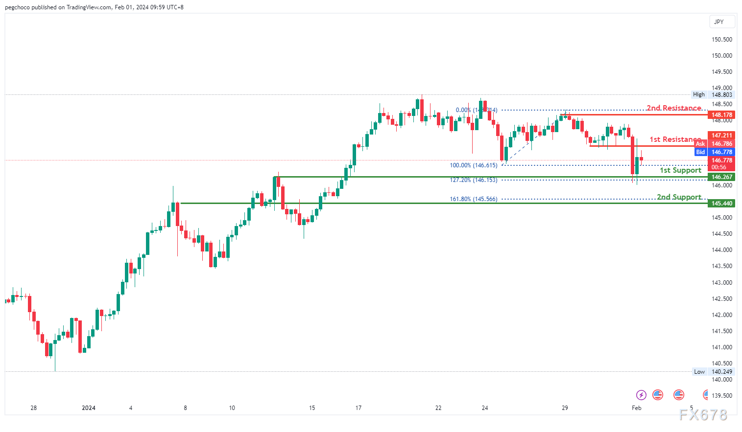 第二个阻力位148.17为多波段高点阻力位,它是价格面临阻力的另一个历史水平。