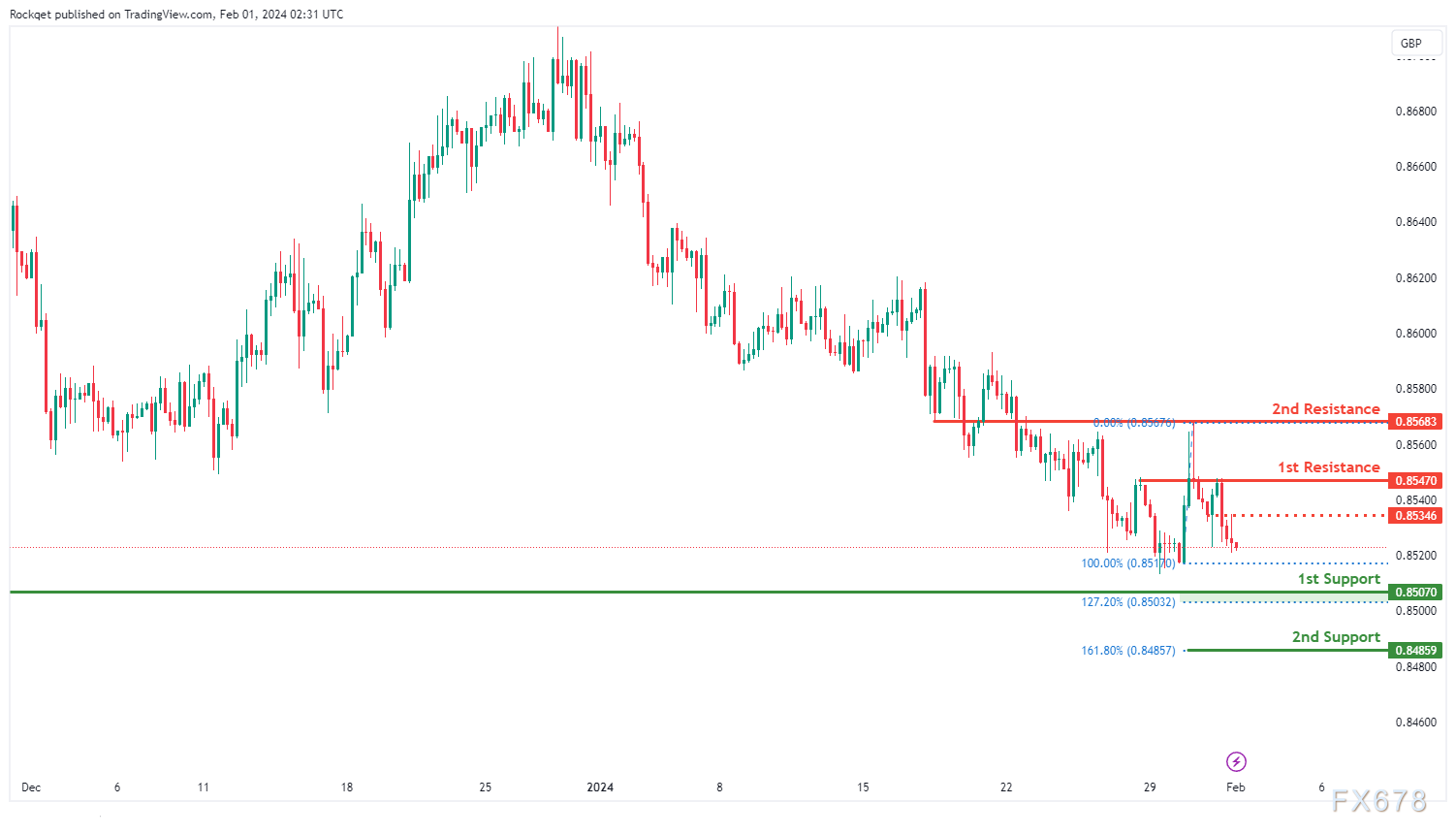 首个支撑位0.85070被认为是有利的。首先,它为一个波动低点支撑位,表明购买兴趣之前已经出现的历史水平。此外,该支撑位与127.20%斐波那契延伸线一致,为潜在支撑区提供了额外的力量。