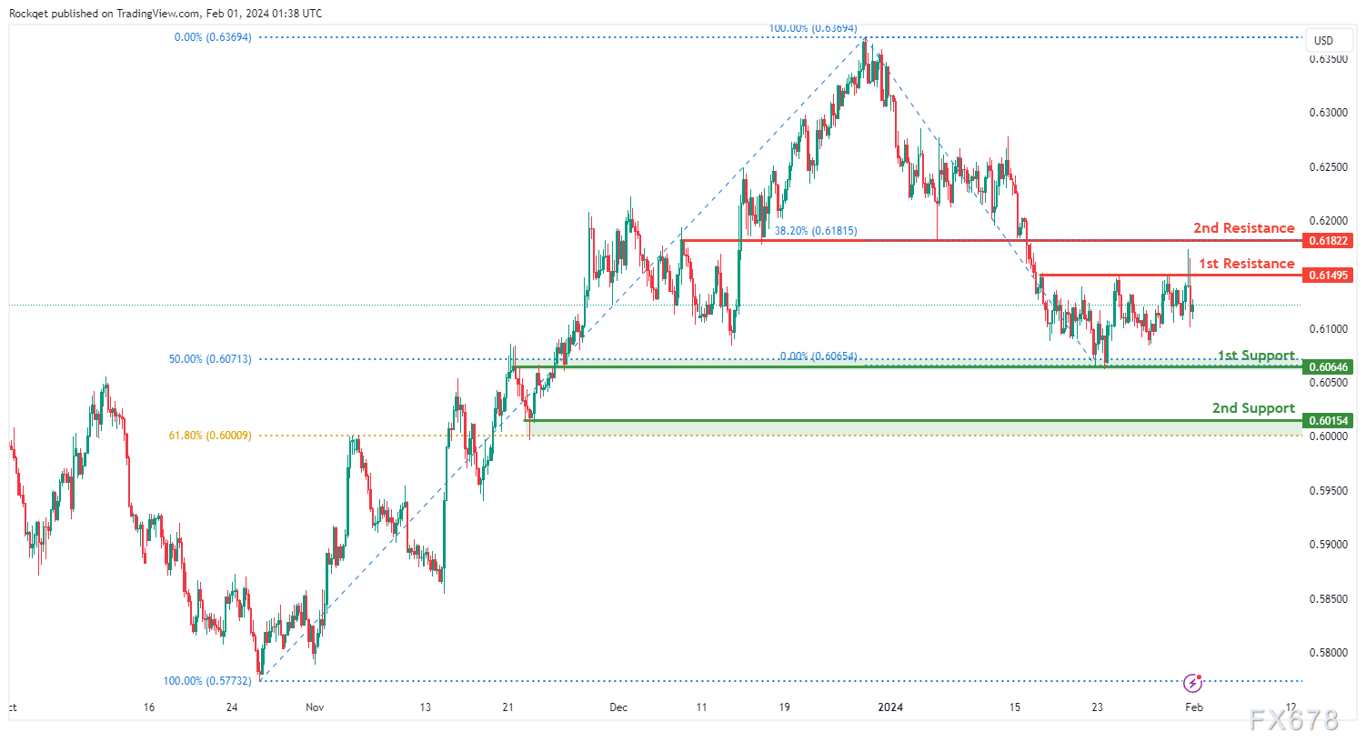 第一阻力位0.6149被视为回调阻力。更高的第二阻力位0.6182被标记为与38.20%斐波那契回撤位一致的重叠阻力,进一步突出了其作为潜在阻力点的重要性。