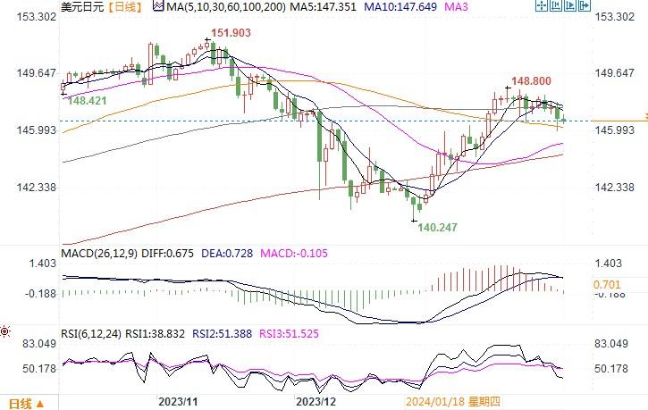 美元兑日元下跌0.25% 至147.26,盘中最低曾抵达146水平。这主要是美联储宣布维持率不变给到日元一定的回升理由。此外,周三的一份会议记录显示,日本央行决策者在1月份讨论了近期退出负利率的可能性以及逐步退出该行大规模刺激计划的方案。1月会议意见摘要显示,央行的决心正在增强,且有愈来愈多委员认为结束负利率的条件正在逐步具备。若本周后续的美国经济数据一般,美元/日元或存在继续回落的趋向。日线图上,前段时间横盘的低位支撑已下破,目前价格盘旋于布林带中轨线(146.80)附近,若跌破,美元/日元回落幅度将加大。上方看来在149附近构成了较重的阻力。