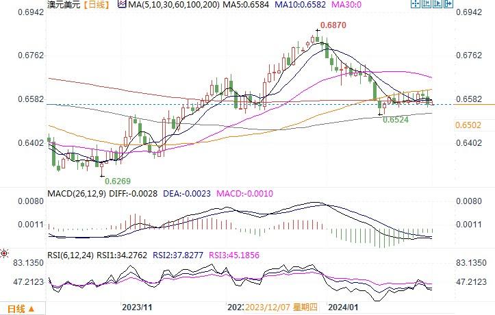 澳元兑美元下跌0.3%,报0.6581,远离周二触及的两周高点0.6625美元。周三稍早,澳洲公布第四季消费者物价指数(CPI)增长率放缓至4.1%,创两年低位,且低于预期的4.3%,与第三季的5.4%相比大幅下降。核心通胀率从5.2%降至4.2%,低于澳洲央行自己预测的4.5%。弱于预期的数据为澳洲央行比多数人预期的更早降息铺平了道路。外界认为澳洲央行肯定会在下周的政策会议上维持利率在4.35%不变,并可能软化其紧缩政策倾向。利率期货市场暗示6月首次降息的可能性从数据公布前的54%上升到64%左右。目前,8月降息25个基点的可能性已被完全消化,2024年的总降息幅度预期也从42个基点升至48个基点。与美元相比,在利差因素方面遭到进一步削弱之下,澳元走势变弱。日线图上,澳元/美元整体仍处在布林带通道中轨线之下,技术指标亦没有明显转向痕迹,澳元整体走势仍偏于弱势。下方关键的支撑在0.65,若下破,澳元/美元将延续跌势。上方只有彻底突破横盘区间的阻力水平0.6625,方有望转跌回升。