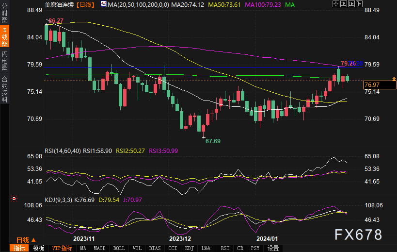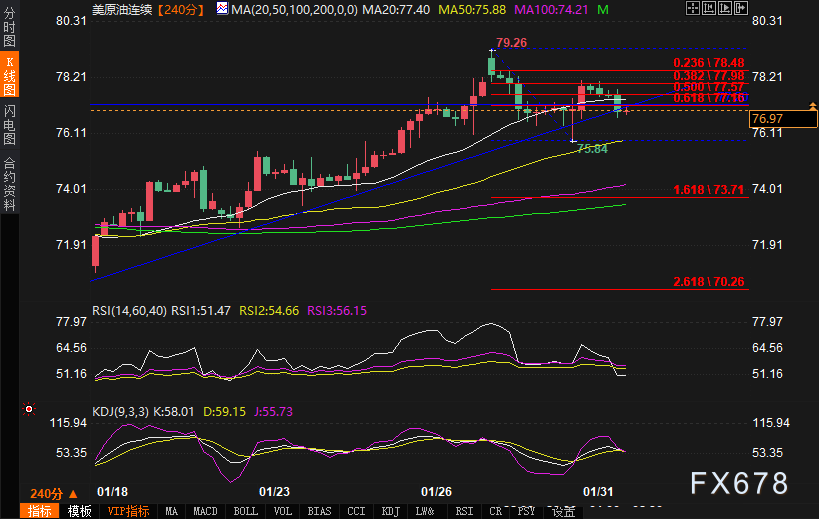 美原油连续震荡下跌,盘中报76.91美元每桶,跌幅1.1%。