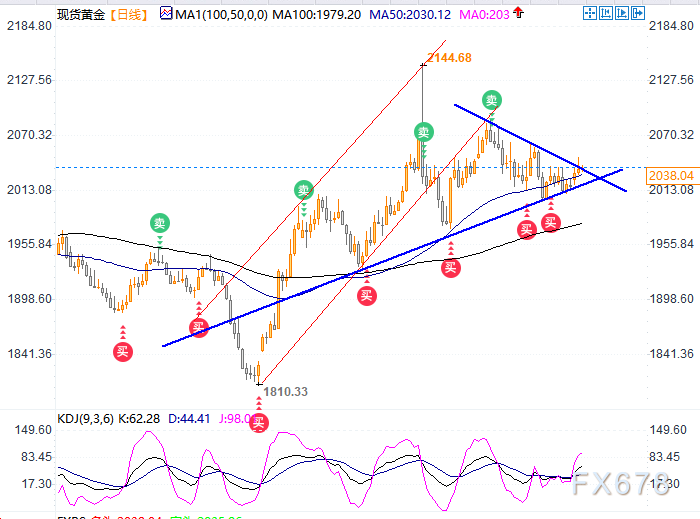 金价似乎正处于一个关键的关口,正寻求确认突破一个月来的对称三角形态。如果金价日收盘价高于2036美元/盎司,那么可能确认突破三角形态。