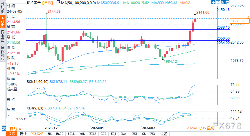 现货黄金冲高回落。盘中最高触及2141.66美元/盎司,距离去年12月创下的历史最高记录2144.68美元/盎司仅3美元。现价格回落至2127.18美元/盎司,涨幅0.61%。